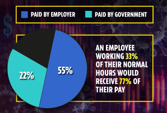 Someone working for 33% of their usual hours would get paid for those hours by the employer. However, the hours NOT WORKED would have a partial subsidy. A third from the employer and a third from the government.