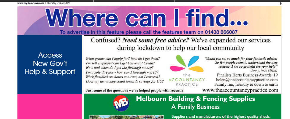 We strive to offer free advice to our local community and business users. Even if they are not clients. And we have dealt with many enquiries from non clients, especially over the last few months. We have done this actively since Covid has forced everyone to take real note of government announcements and schemes, which change rapidly. It’s great when the local papers also support our efforts and spread our information to reach as many people as possible.